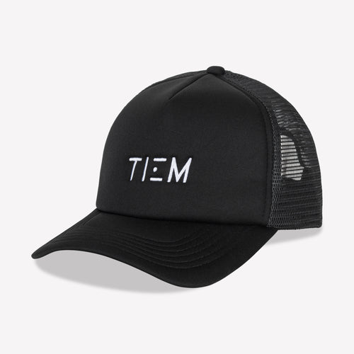 The perfect hat to throw on after a workout. This black trucker hat features a white TIEM logo on the front panel and has an adjustable back.